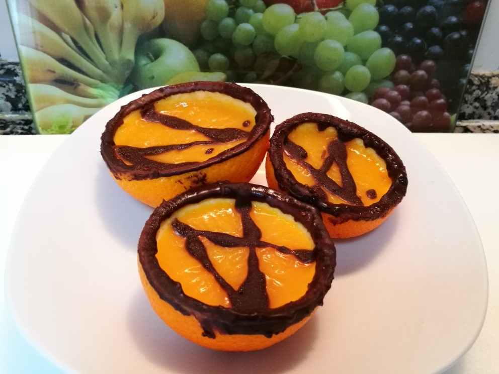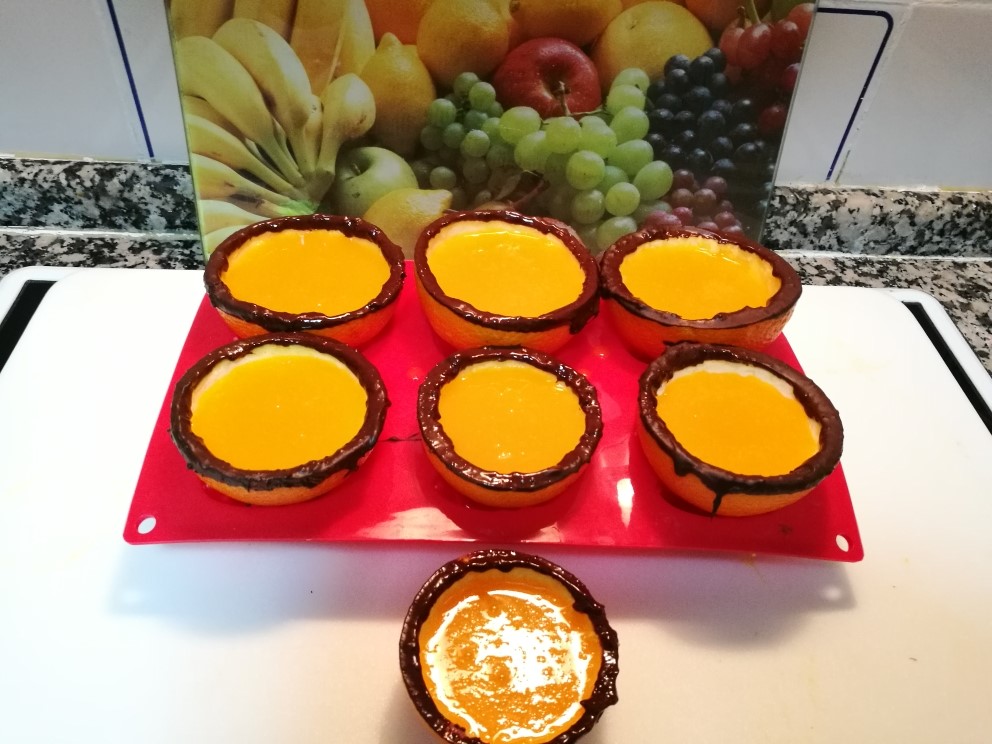 - Ponga en el vaso 500 gramos de zumo de naranja, el azúcar y el sobre preparado de natillas, yo también le he echado una cucharadita de maicena. Programa 8min./100ºC/Vel.4. Terminado el tiempo vierta la crema en las mitades de naranja reservadas. Dejar 5 minutos que baje la temperatura de la crema y decore con el resto del chocolate, formando un dibujo o figura, dejar enfriar en el frigorífico un mínimo de 2 horas.