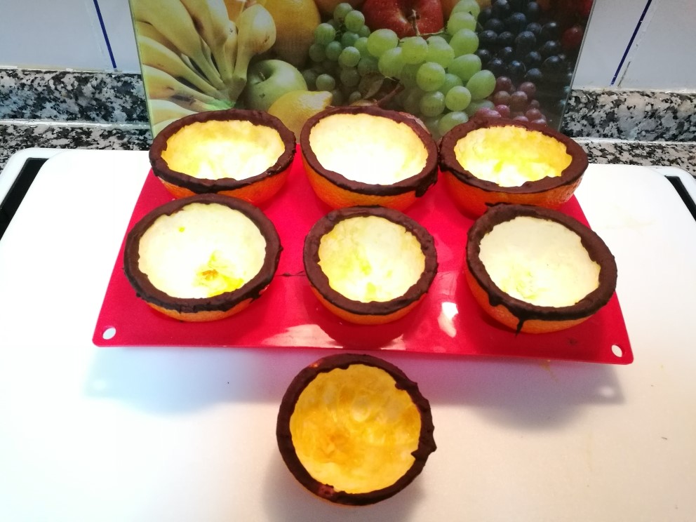 - Ponga el chocolate en un plato hondo y fúndalo en el microondas. (yo lo he fundido metiendo el chocolate troceado en una bolsa de plástico lo he metido en el cestillo, cerrando la bolsa con una pinza, he metido medio litro de agua, he programado el thermomix 15min/120ºC/vel. 1, he fundido el chololate, una vez fundido la mitad la he echado en un plato hondo, y he pasado las mitades de las naranjas por el chocolate, he colocado estas en un molde de muffins para que se mantengan rectas y las he reservado en la nevera.