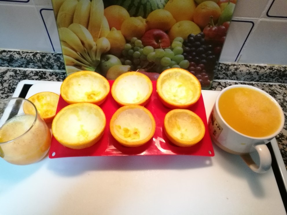 - Corte las naranjas por la mitad, con un exprimidor, exprimirlas y reservar el zumo y las 6 mitades de naranjas. Con una cuchara pequeña, retire la pulpa de las 6 mitades con cuidado de no romperlas y reserve.